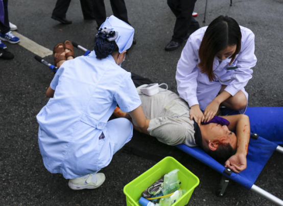 图为演练现场:医疗救护组对受伤人员进行现场救护