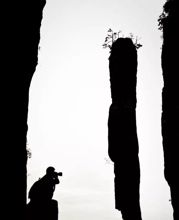 除了早上日出时太阳出来会儿,游览过程中都没有见到阳光。阴天下的一炷香孤傲独立,小伙伴们围着它开始创作!抱抱它,亲亲它,利用剪影摆出各种不同的姿势,特别有趣哟!