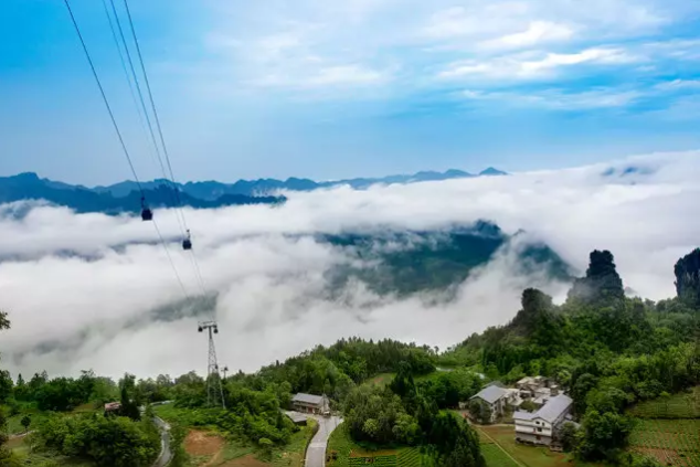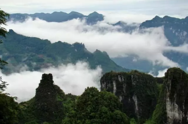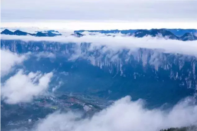 快到峰顶处,有二条道可行,我们还是选择了惊险的“绝壁长廊”,这长廊是人工造就,似乎长在大山的边缘,虽有护栏,但总是觉得怕怕的。雨,还在下。穿着雨衣,小心翼翼地走着,身边云雾缠绕。我壮了壮胆,走到边缘,探头望去,并没有看见山脚,云雾层叠,倒是为我减少了一半的害怕,若是晴天,应该是能望见山脚,那种怕,也许应该会更多些。感谢云雾,虽然看不见山有多高,但给我一种假象的安全感。绝壁长廊,七道弯八道拐,前面的人回头看看后面的,感觉他们都在云端里站着。看前面,云雾触手可及,我真想学着嫦娥飘飞在云雾中,希望云雾入我胸怀,真想摇动着两只手臂向前飞奔,我担心长廊的坚固程度,边上的护栏似木头组成,若是动作太大,是否会影响到其他的游客。