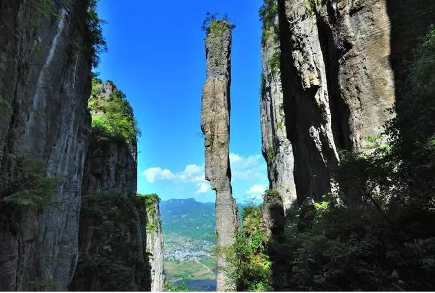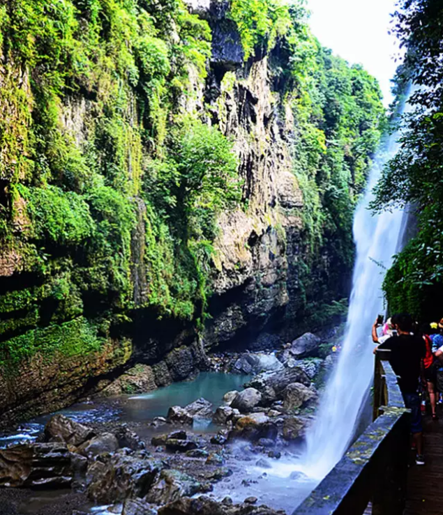 拾阶而上,走了好多台阶,“云龙地缝”,还是没有看见。爬几级,抬头看看雾密云浓,干劲十足,大家互相鼓励着。不知谁眼尖,看到了导游站在我们的前方。我问导游,不见你一起爬上来,怎么就跑我们前面了。她告诉我,说是走了近道,原来这山还有近道,专供导游们走的,想来一定不像我们这样盘旋而上,也不用这么累吧。导游指着远处,说那就是“云龙地缝”,烈谷地缝,天然形成,两岸陡峭,低头看,有种晕眩之感,想来很深吧。看那飞瀑狂泻,急呼壮观。缝底流水潺潺,似云似龙,真是一大奇观。