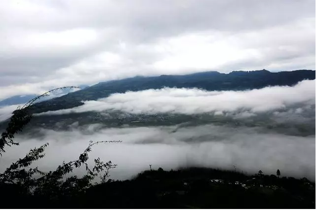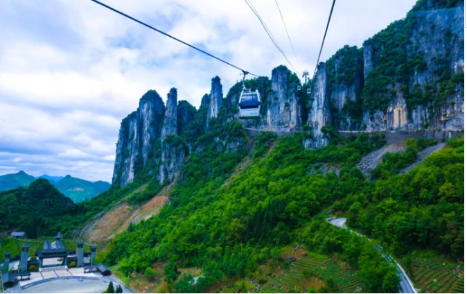在山顶缆车上站外的观景台,我刻意观察了山间的观光车停靠站,那是一块山中平坝,也是步行入口。远远望去,公路从山脚蜿蜒而上,村庄、田园、果园散布其中,在流动的云雾中忽隐忽现。从停靠站到山顶,需沿小楼门群峰间的栈道上山,大概也就2公里路程。而停靠站入口,正是三峰独立、一门洞开的小楼门景点。也就是说,坐缆车上山的游客无法感受到小楼门那壁立千仞,山门洞开,由下至上的峰林风光。