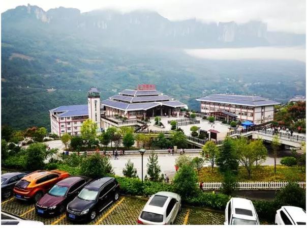 回到换乘中心,从这里到山顶的七星寨景区有两条路选择:一是搭乘景区观光车到半山一个叫做“倒灌水”的地方,开始登山;二是乘座景区的厢式缆车直达山顶。前者适合脚力较好者,后者适合体力较弱者。因自身身体状况加之70多岁的母亲和我们同行,我选择了坐缆车上山。