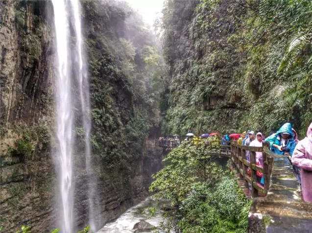 不远处的公路拱桥左转,不一会便到达峡谷的人行栈道,栈道建设在距离峡谷谷底的山腰间,平视可观悬崖峭壁,怪石嶙峋;俯视可见谷底乱石遍布,流水潺潺;仰望可视峡壁飞瀑,古木苍翠。而头顶的悬崖间,间或有瀑布从身边流下,直落谷底,正是“千仞泻联珠,一潭喷飞霰”。流水发出的咆哮声、瀑布击打乱石的轰隆声,在峡谷组成了一曲水石交响乐,让游客乐在其中。在我的眼里,两岸陡峭峡壁上呈黯黑、油黄色的钟乳石是峡谷一景,这些只是存在于溶洞里的钟乳石经过亿万年的变化,生成各种形态,而今一见天日之后,经过阳光雨露、春夏秋冬的反复打磨,黯然失色却光滑圆润,形态各异且多姿多彩;而峡谷两岸的瀑布则又是一景,大的瀑布如大坝决堤,气势恢宏;小的瀑布如涓涓细流,从山间树丛间流下,有如白练飞舞,有如一条细长的皮尺丈量峡谷的高度,有的直达谷底的河面,泛起浪花几朵,有的还在半山,便腾化为雾,在谷间漫延。再则是谷底的巨石、深潭,岸边的绿树,为我们提供了一幅幅自然天成、风光曼丽的山水画图。而让人遗憾的是:由于是阴雨天,阳光一直躲在云层里没有出来,更没有照入谷中,这里经常出现的瀑布彩虹交汇的奇观迟迟没有出现。