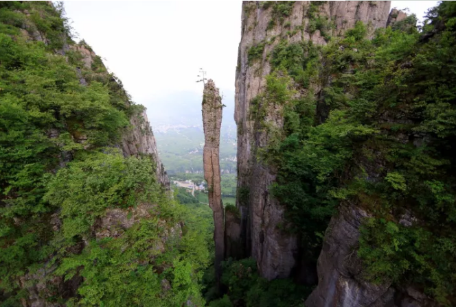走完绝壁长廊,就进入中楼门景区,相传女娲娘娘就是通过这道门完成补天的,有一山峰名群星岭,山上的石头是女娲娘娘补天的辅助材料;有一山峰名骄顶山,上面有女娲娘娘的专骄,是专门用于从天星门到南天门运送补天材料的工具。传说归传说,但远远望去,确实形神兼备,当然也寄托了人们对女娲娘娘的感恩之情。