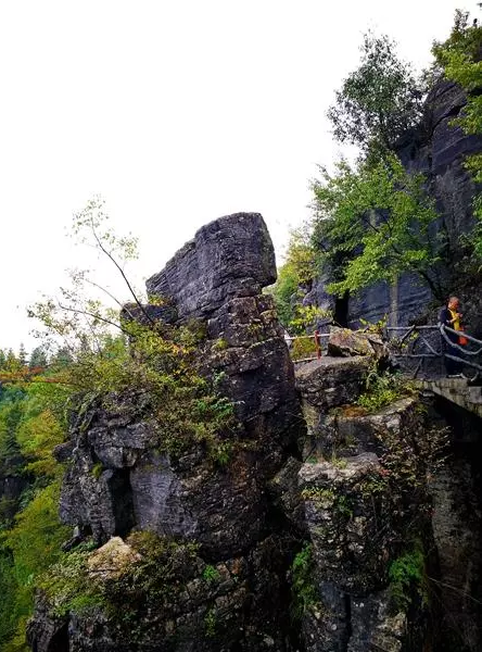 岩湾休息区出来又开始爬山,不一会就到达一个叫“迎客松”的景点,它与黄山的“迎客松”相似,在悬崖峭壁间张开它的双臂迎接天下客人,并深深鞠上一躬,象征土家、苗族儿女的好客之道。