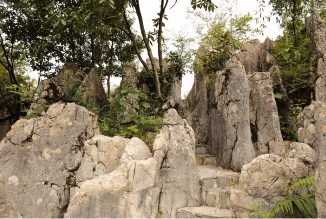 在石半板路上,抬眼望去,一个个裸露的石林耸立在荆棘丛中,相对于云南路南石林,这里的石林显得矮小了许多,大多成块、成片分布,有些石林、山堡仍然隐藏在植物林间。在我们行走的过程中,一片石林在道路两旁起伏连绵,奇特的山石光滑而呈现规律的纹理,一看景点指示牌,是为楼门石浪;一块全身呈薄片状整齐排列的巨石出现在道路中间,是为手风琴;一块如金元宝的巨石耸立在道路右侧,周身已经被游客摸得光滑细腻,是为圆宝石;一排排整齐如墙的石林间隔出的小巷,犹如石林迷宫---有人说“恩施大峡谷每一寸都是风景”,的确如此,当你漫步其间,总有一块怪石、总有一片奇峰让你流连忘返,驻足欣赏。