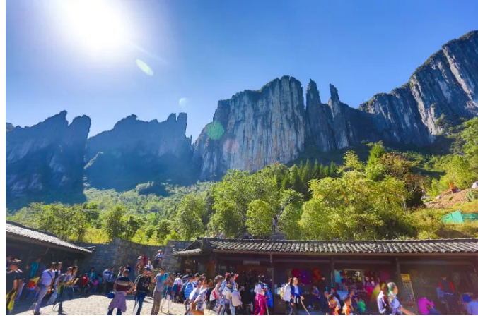 据介绍:七星寨景区是目前恩施大峡谷已经开发的主要景区之一,位于恩施大峡谷西部的前山,海拔1500-1900米,由小楼门、中楼门、大楼门及绝壁组成,面积23.9平方千米。其主要地貌类型有绝壁、岩柱林、孤峰、石芽(林)、峰林洼地、溶洞等。主要景点包括小楼门群峰、石芽迷宫、土司城堡、石门天坑、一线天、轿顶山、千层岩、大楼门群峰、一炷香等50多个景点。