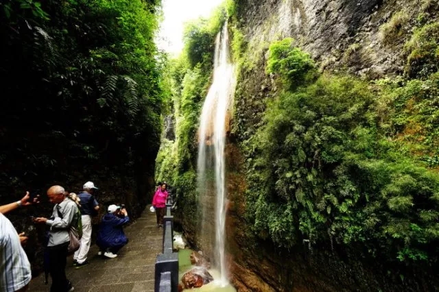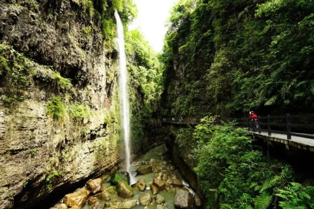 据中国地质大学专家考证这是世界上唯一一条两岸不同地质年代的地缝,但对普通游客来说和别的地缝相比可能最大的特色是形态各异的瀑布群。由于施工我们没法走到返回地面的电梯,只能走中途的一条便道,这条路坡度太大,每级台阶的高度又太高,上起来很费体力。