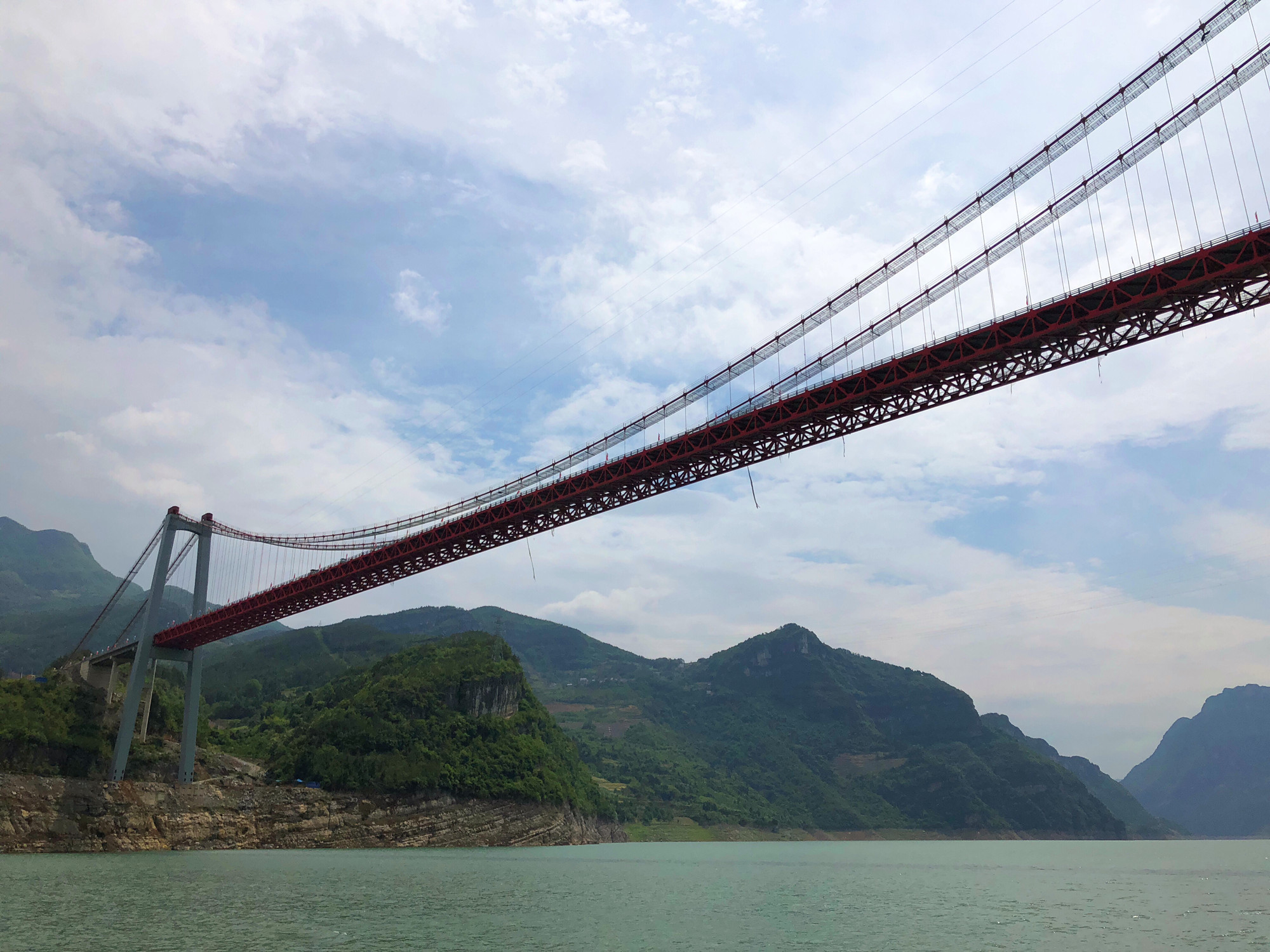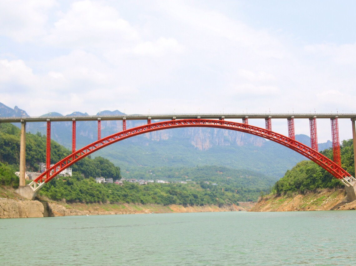 景阳大桥,是水布垭库区移民复建工程的一个重要项目。它全长519米,红色圆弧长260米,设计通航高度为18米。它漂亮的弧线宛若悬挂在天空的一道彩虹,于是被当地人称为彩虹桥。