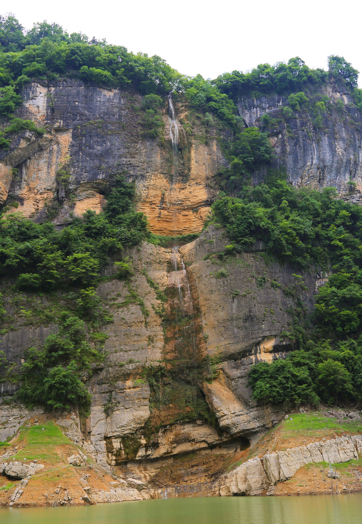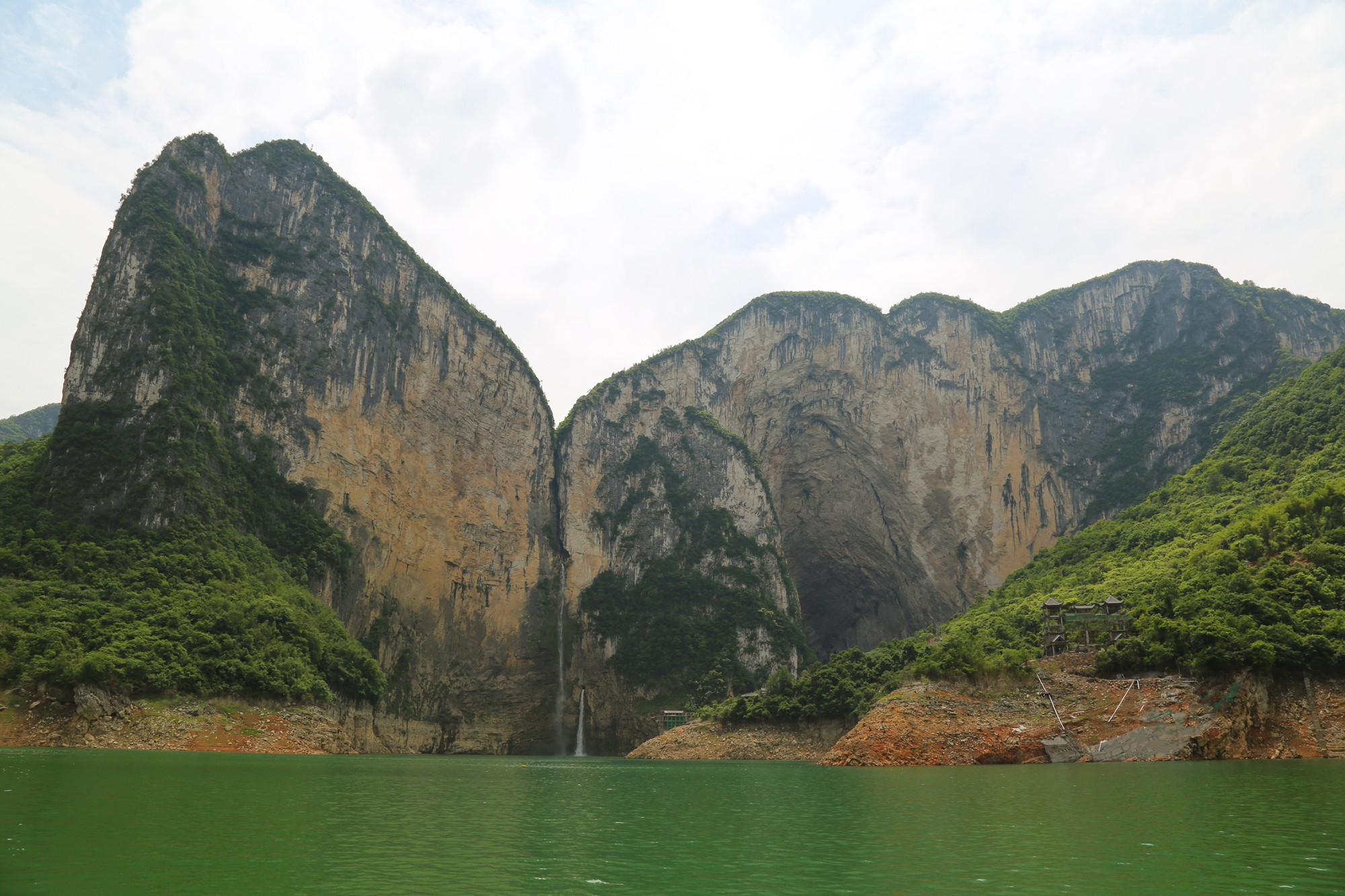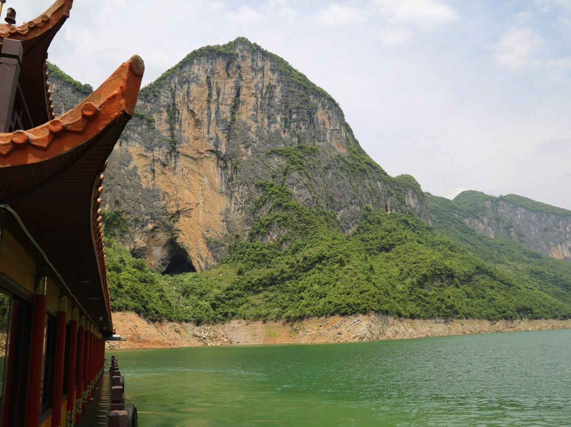蝴蝶崖是大清江的标志性景点,远看就像是一只张开翅膀的漂亮蝴蝶。溶洞景点大多是三分相似、七分想象,而蝴蝶崖连猜都不用,一眼就知道它是什么。雨季水量大的时候,一挂飞瀑在蝴蝶翅膀的绝壁之间涌出,声如雷鸣,极其壮观。而水量小的时候,则又是一种婉约和柔美。山的雄伟结合水中的倒影,一只完整的蝴蝶更是栩栩如生。