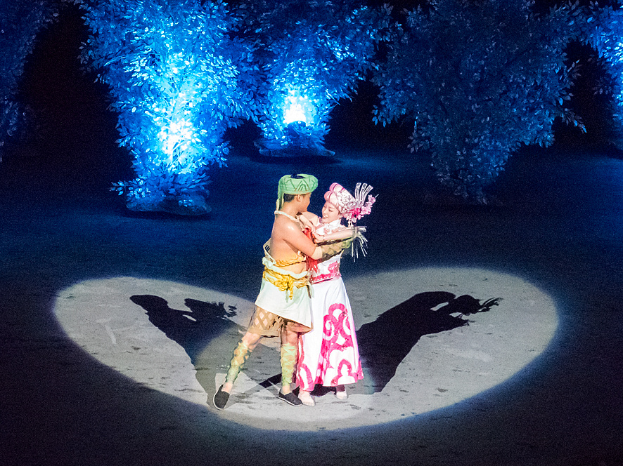 《龙船调》整个表演持续一个多小时,土司女儿和撑船小伙对于爱情的执着让人感动,为爱殉情赴死的故事,看得我潸然泪下。年轮渐长,在社会里摸爬滚打的时间越久,对于感情就越不抱有期待。我还是相信爱情,只是不相信自己!